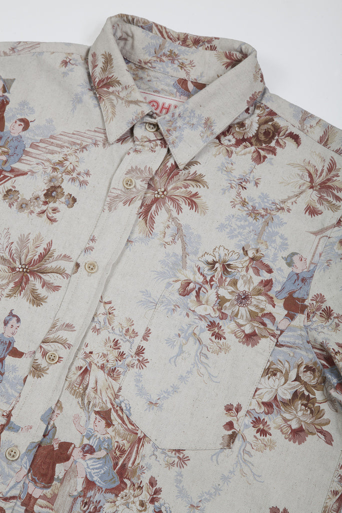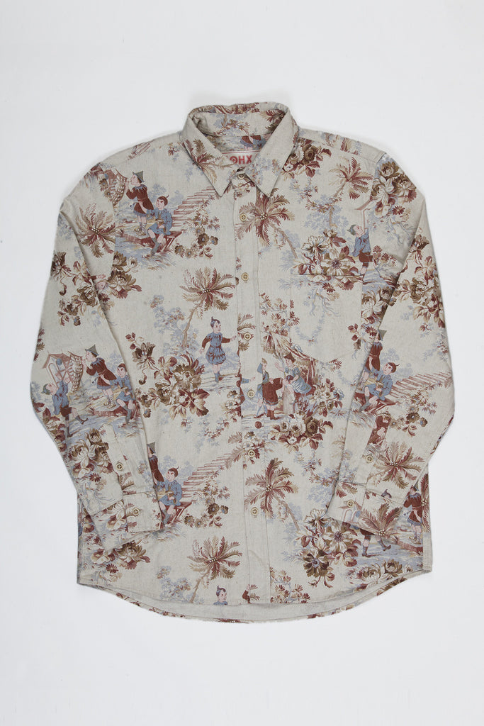 A single pocket, long sleeve tapestry oriented fabric shirt. Features hangers and kids.. playing around and palm trees.