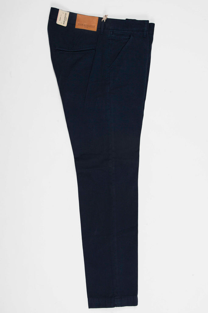 A slim fitting chino in brushed cotton for a super soft hand feel. The design features slant front pockets with a coin pocket.