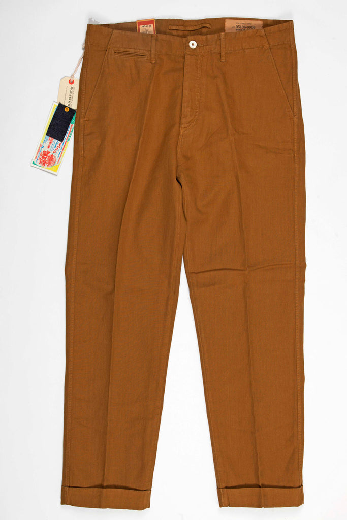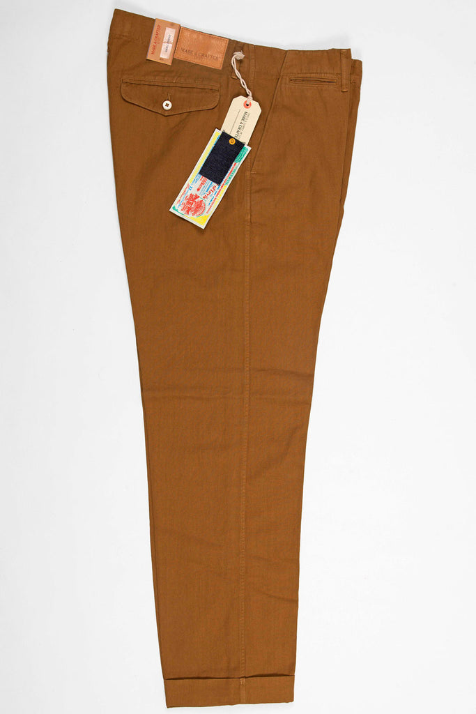 A slim, regular fitting, mid-rise chino with slant pockets on the side and welt pockets on the back. One of the back pockets has a single button closure and the fly has wood buttons.