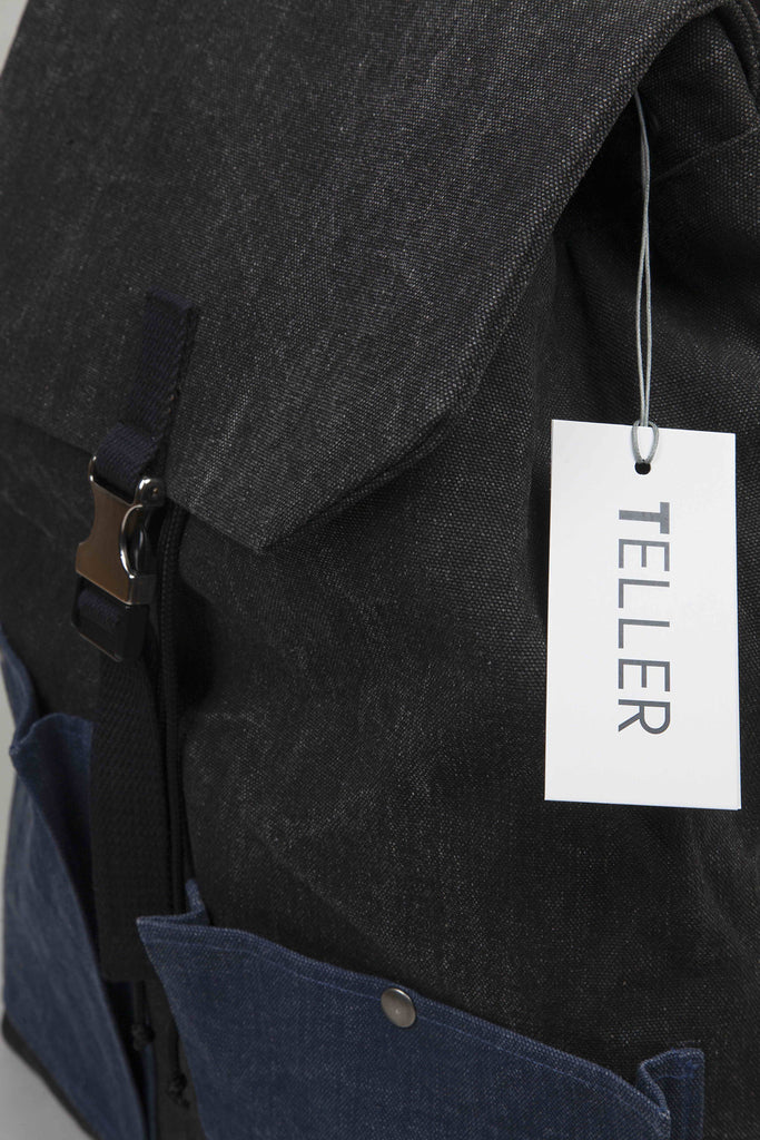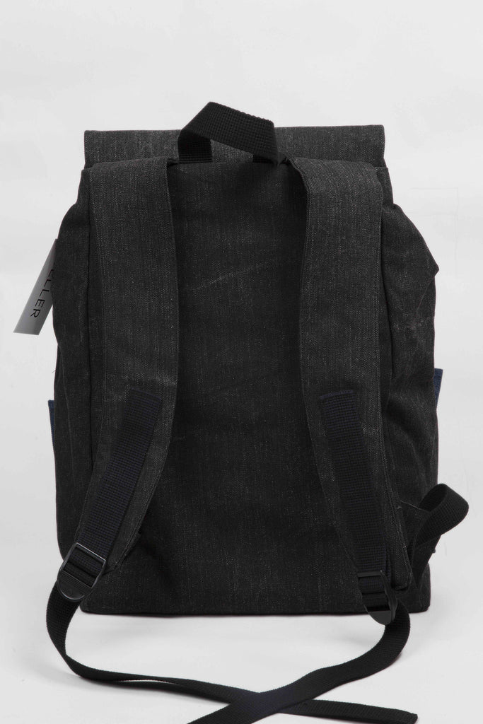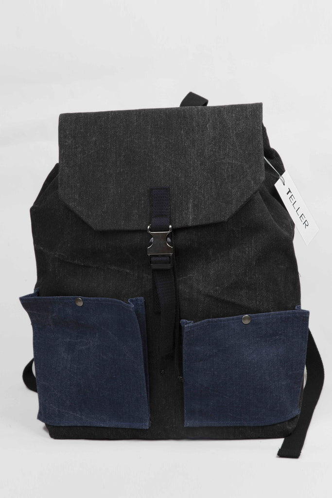 Canvas backpack in navy/black with two unbalanced external pockets, inside cotton lining with inner zip pocket, adjustable shoulder straps. Made in Greece.