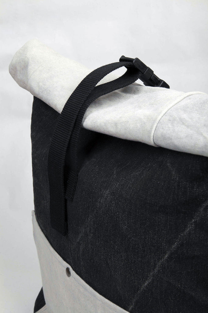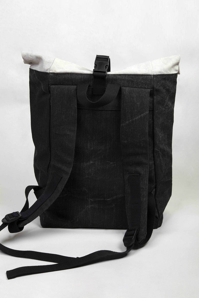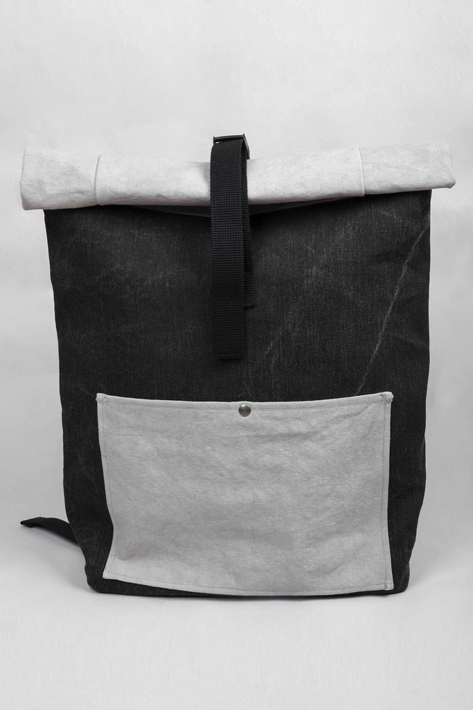 Canvas backpack in black/grey with one big external pocket, inside cotton lining with inner zip pocket, adjustable shoulder straps. Made in Greece.