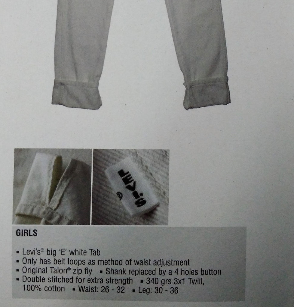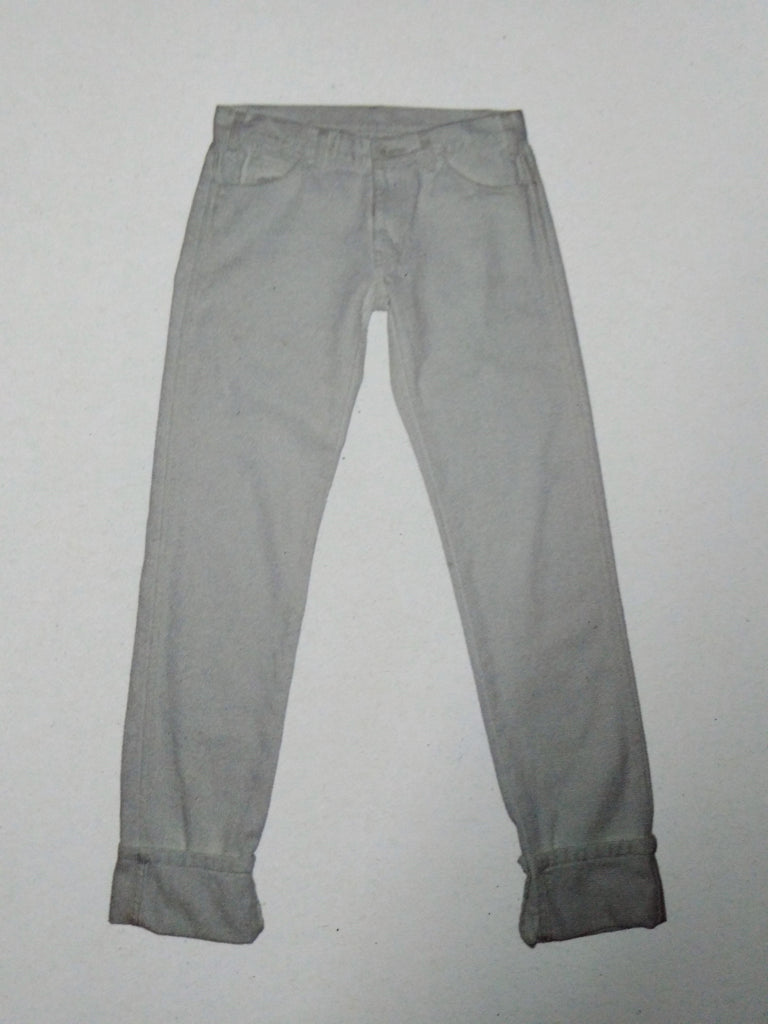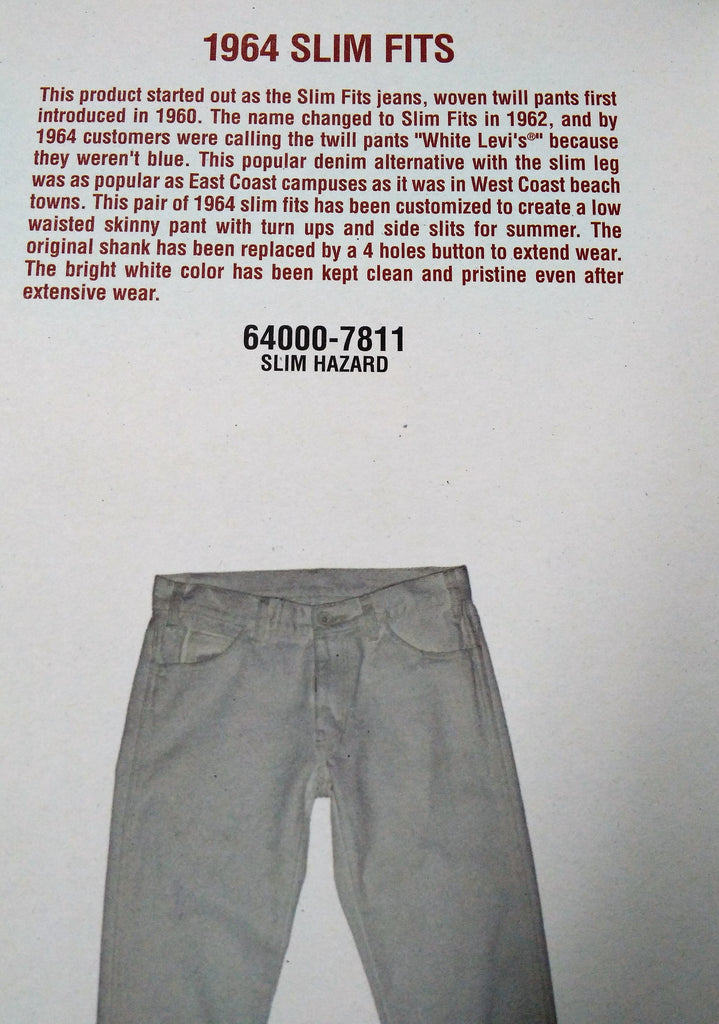 This product started out as the Slim Fits jeans, woven twill pants first introduced in 1960. The name changed ti Slim Fits in 1962, and by 1064 customers were calling the twill pants "White Levi's" because they weren't blue. This popular denim alternative with the slim leg was as popular as East Coast campuses as it was in West Coast beach towns. This pair of 1964 slim fits has been customized to create a low waisted skinny pant with turn ups and side slits for summer. The original shank has been replaced by a 4 holes button to extend wear. The bright white color has been kept clean and pristine even after extensive wear.